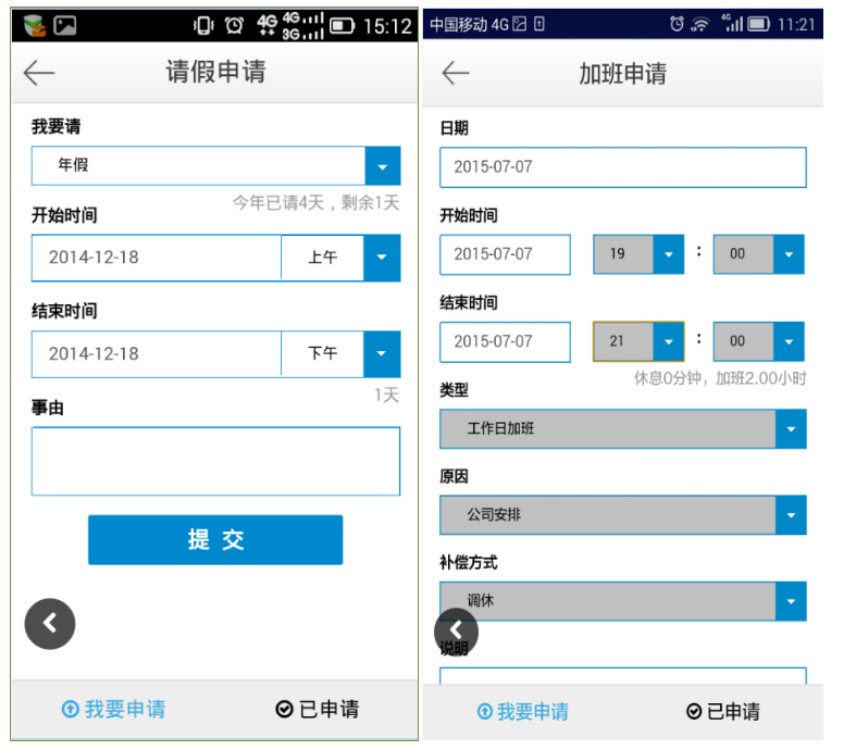 以處理人員考勤為例,員工隨時通過手機能查看到本人的考勤異常情況,什么時候有過遲到,早退現象,加班小時多少,是否有缺卡,年休假還剩余多少等,統統一目了然,并能自行提交簽卡,請假等申請,由管理人員對申請記錄進行審核后,數據自動進入到同鑫eHR系統中參與計算,做到了數據的及時性和準確性,也使管理人員擺脫了大量的簽卡和請假數據的輸入工作,極大地提高了管理人員的工作效率。